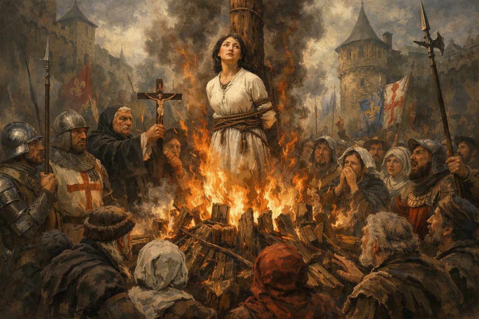 Позже Жанна сопровождала Карла VII к коронации в Реймсе — событию огромной политической важности. Но уже в 1430 году её захватили бургундцы и передали англичанам. Суд, организованный их сторонниками, обвинил Жанну в колдовстве и ереси. Приговор был жесток: в 1431 году её казнили на костре в Руане.